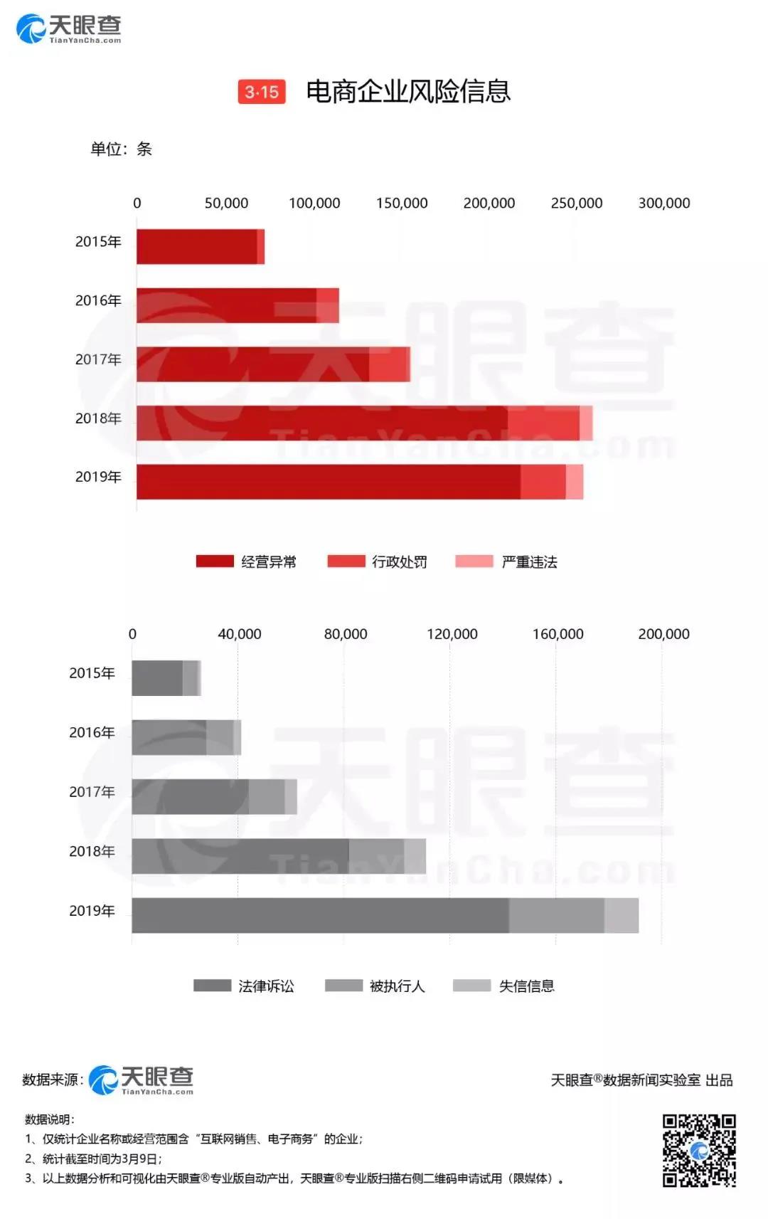 從司法風(fēng)險來看,法律訴訟案件數(shù)量持續(xù)上漲,僅2019年就達14萬件。此外,電商企業(yè)近5年共產(chǎn)生8.6萬條被執(zhí)行人信息和超3萬條失信信息。