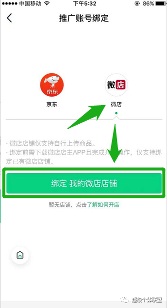 4.選擇微店,點擊【綁定我的微店店鋪】。